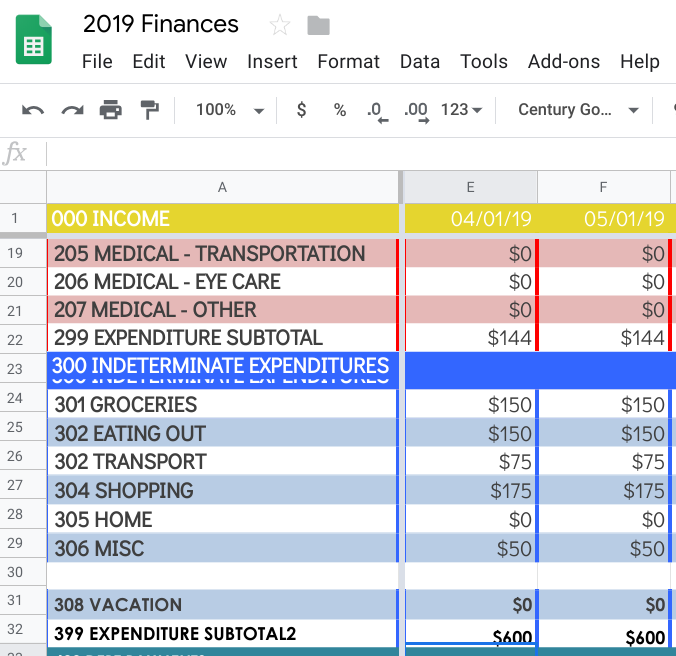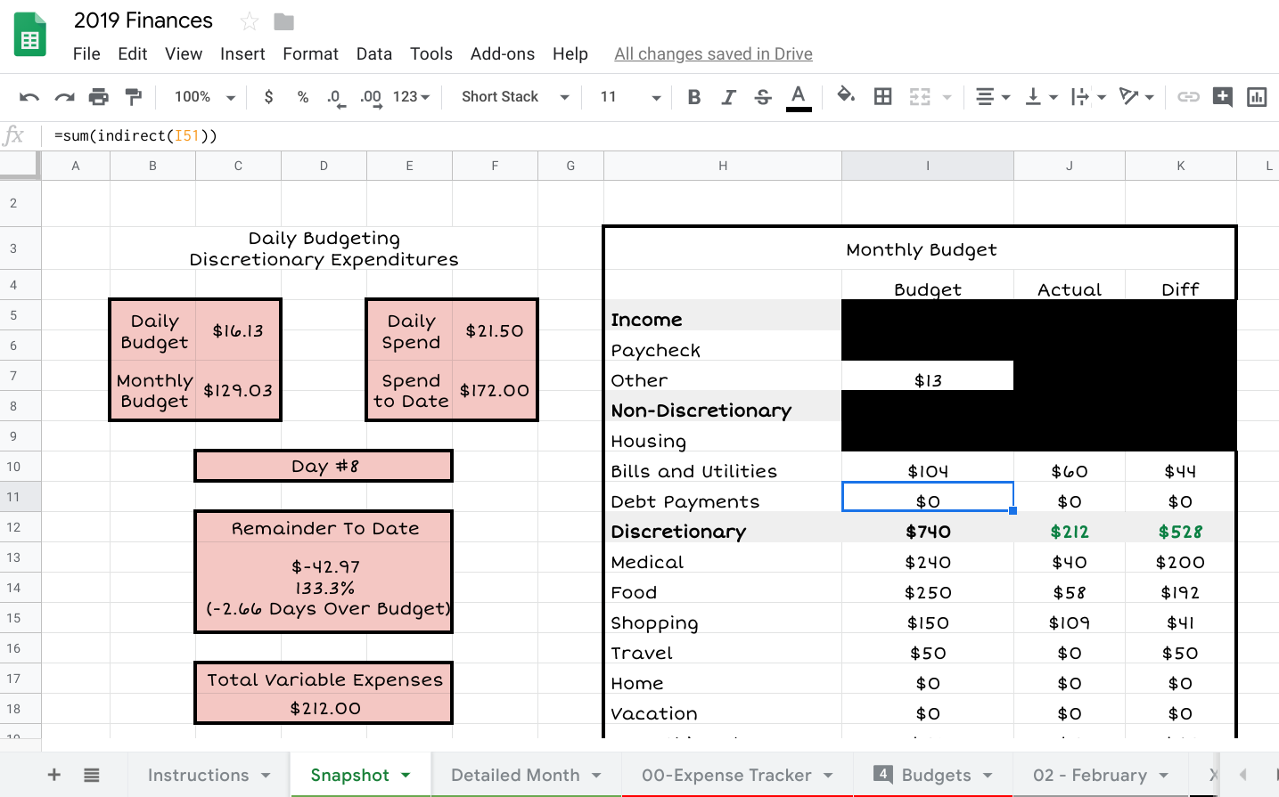 Within this document, I spend 95% of the time inputting my daily transactions and/or visualizing a snapshot of my spending-to-date. But, as stated, I do maintain other tabs as well. For instance, there is a more detailed month-to-date sheet that I rarely look at: